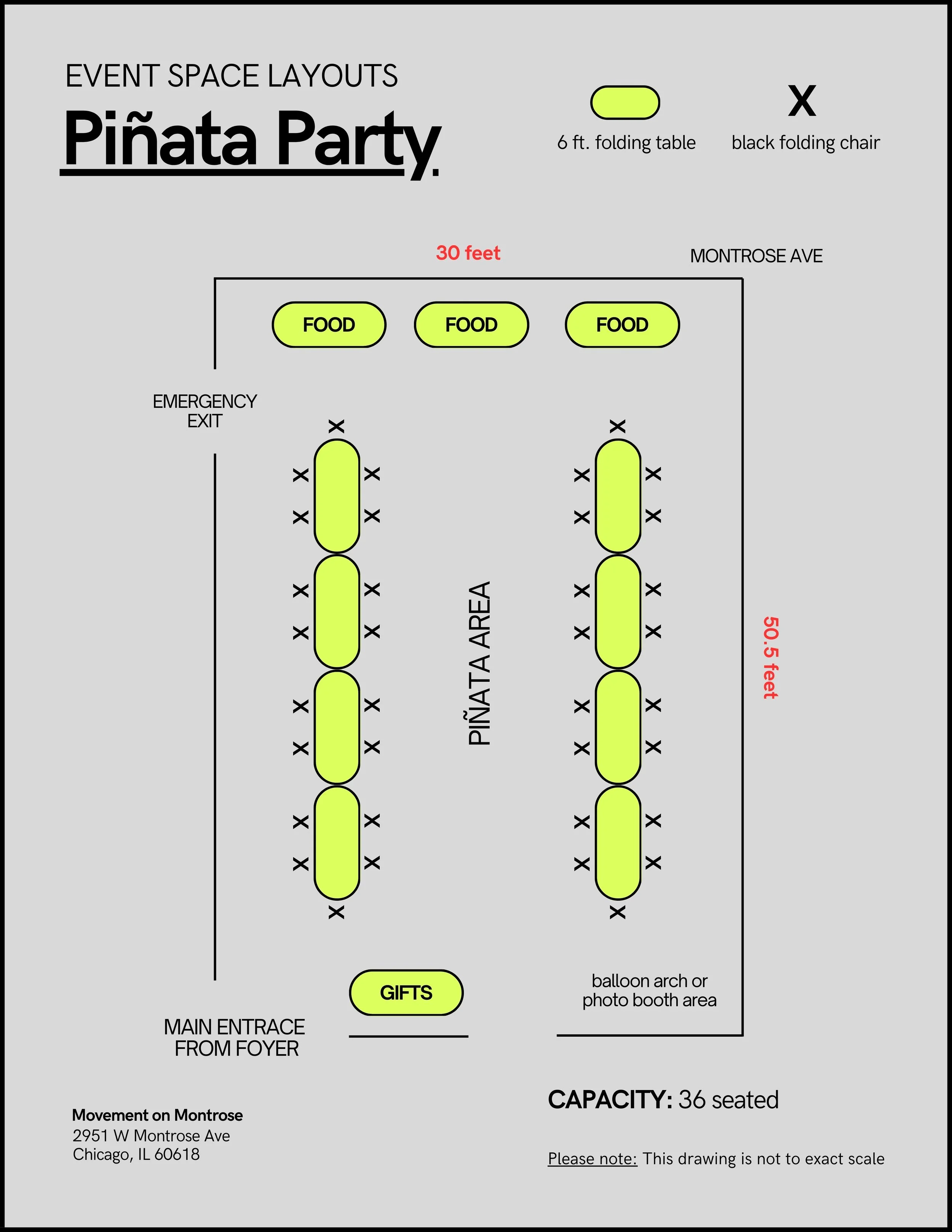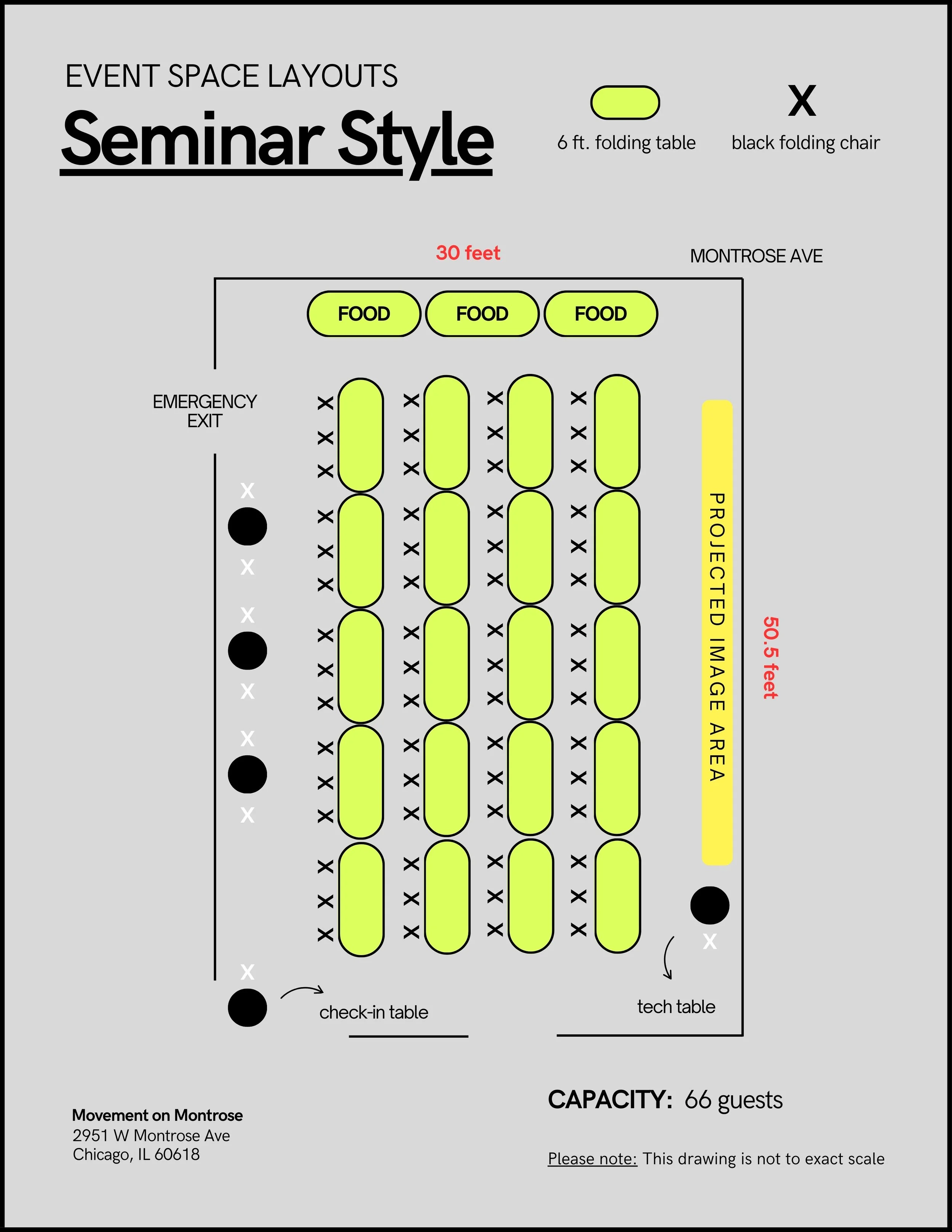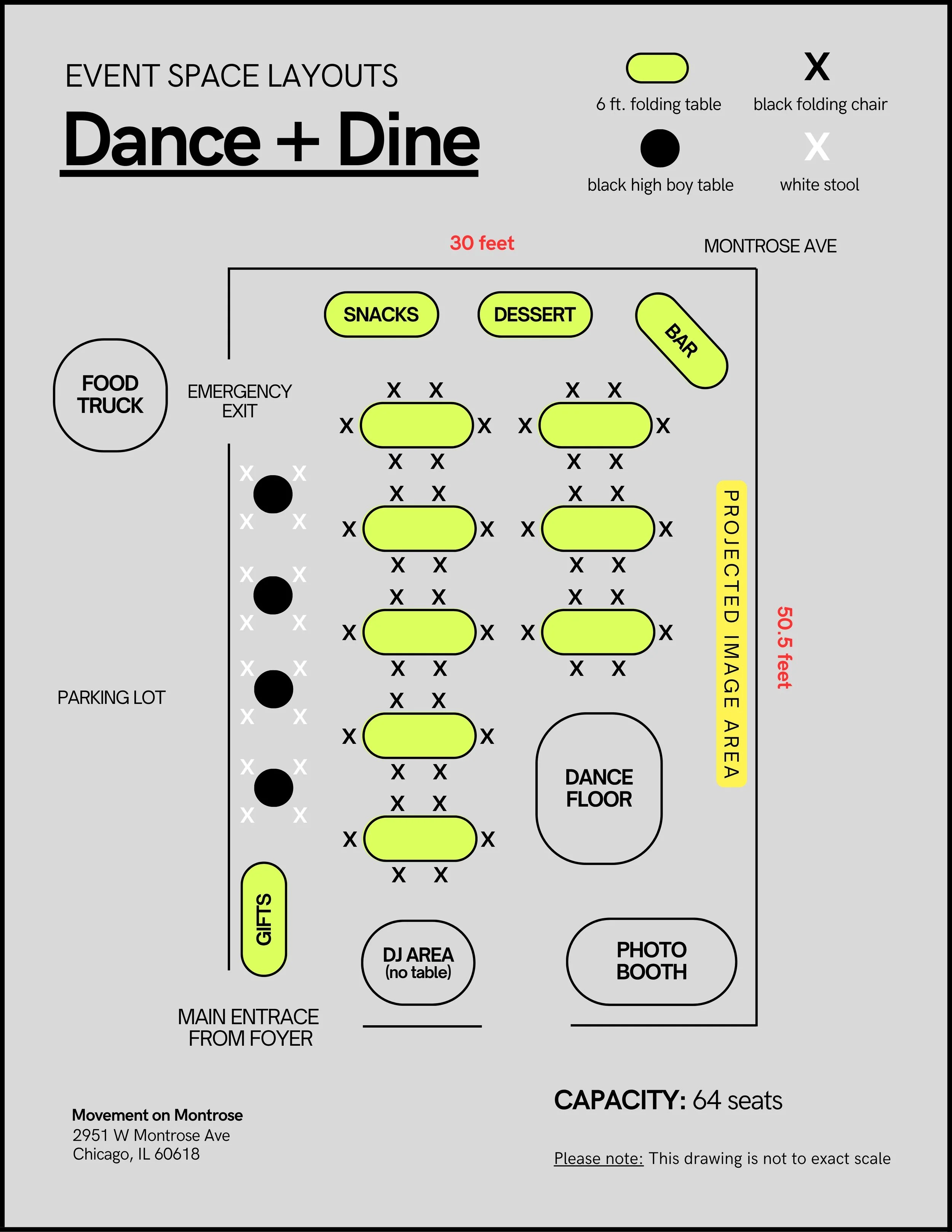 All event space bookings include access to our green room, parking lot, coat room, 6 ft. folding tables, tablecloths, black folding chairs, high boy tables and stools, guest wifi, chafing trays, and assorted party supplies. The space has a polished concrete floor and is also equipped with an aerial rig which can be used upon request.