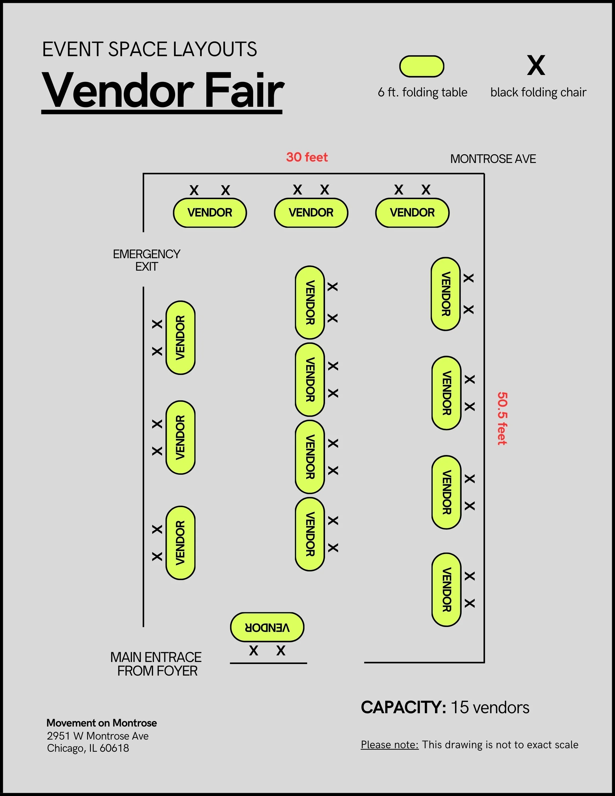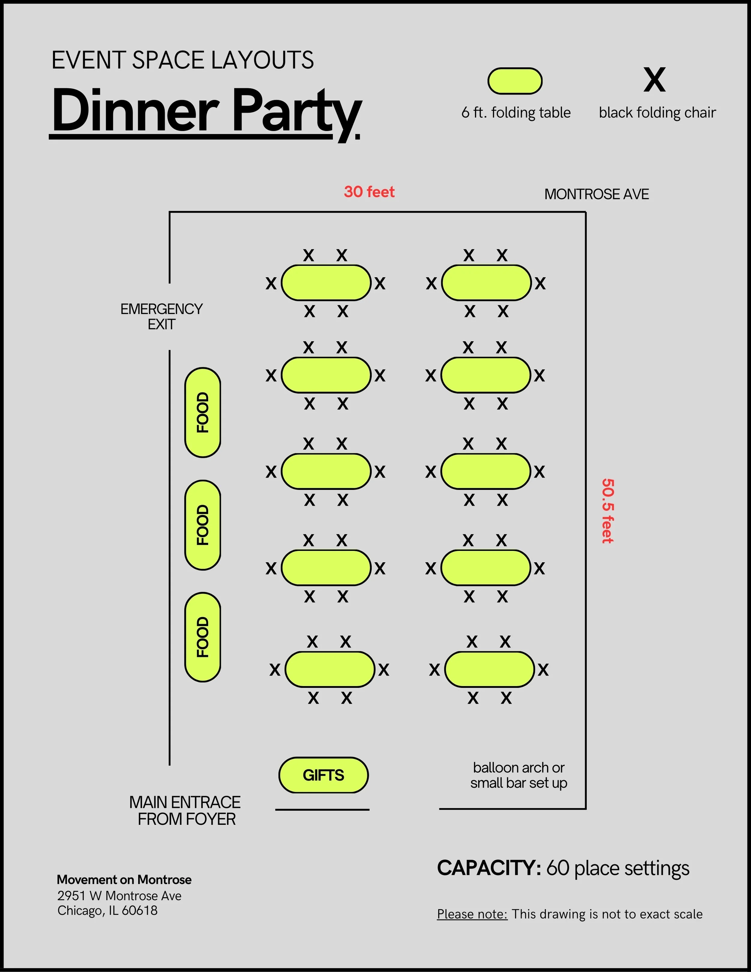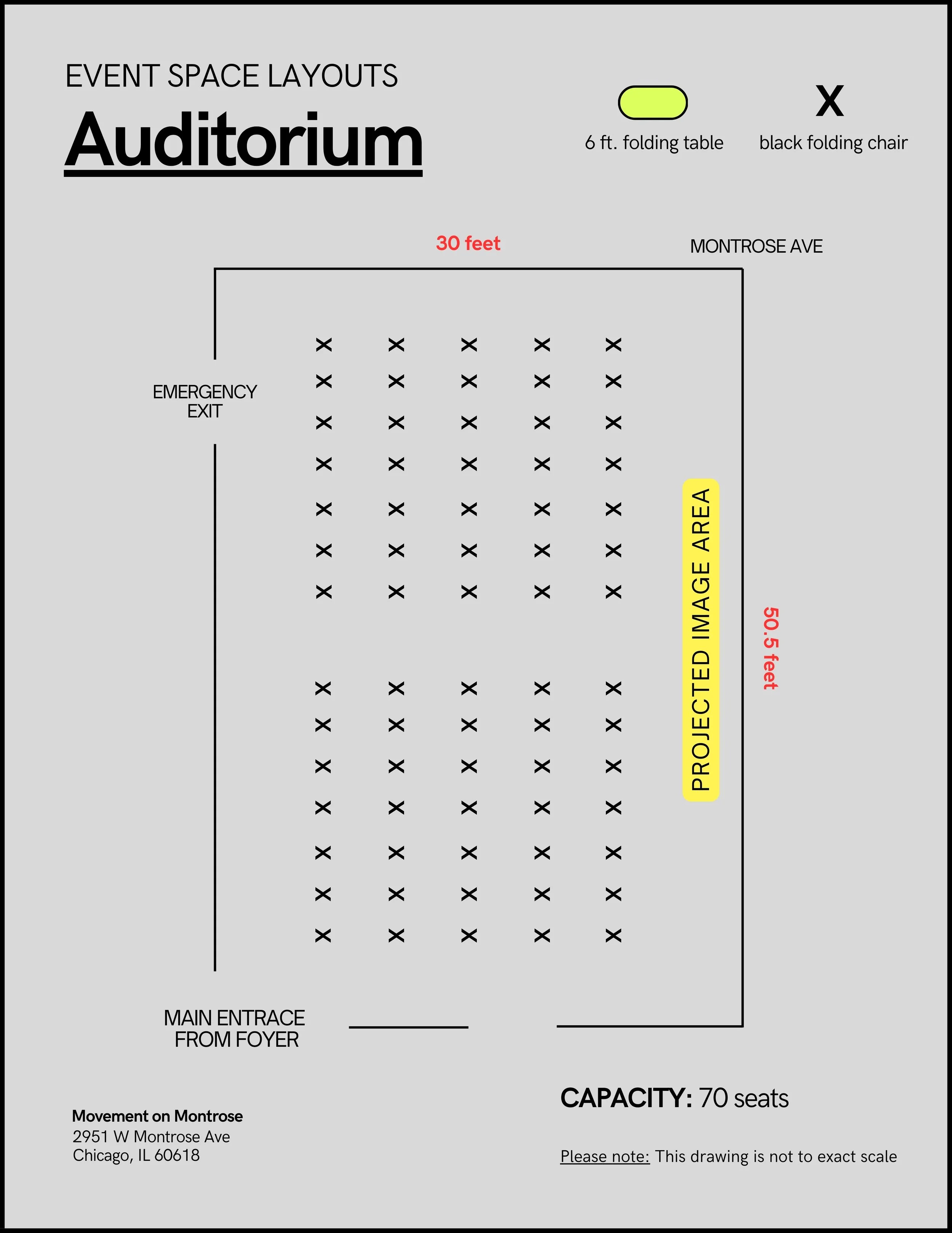 All event space bookings include access to our green room, parking lot, coat room, 6 ft. folding tables, tablecloths, black folding chairs, high boy tables and stools, guest wifi, chafing trays, and assorted party supplies. The space has a polished concrete floor and is also equipped with an aerial rig which can be used upon request.